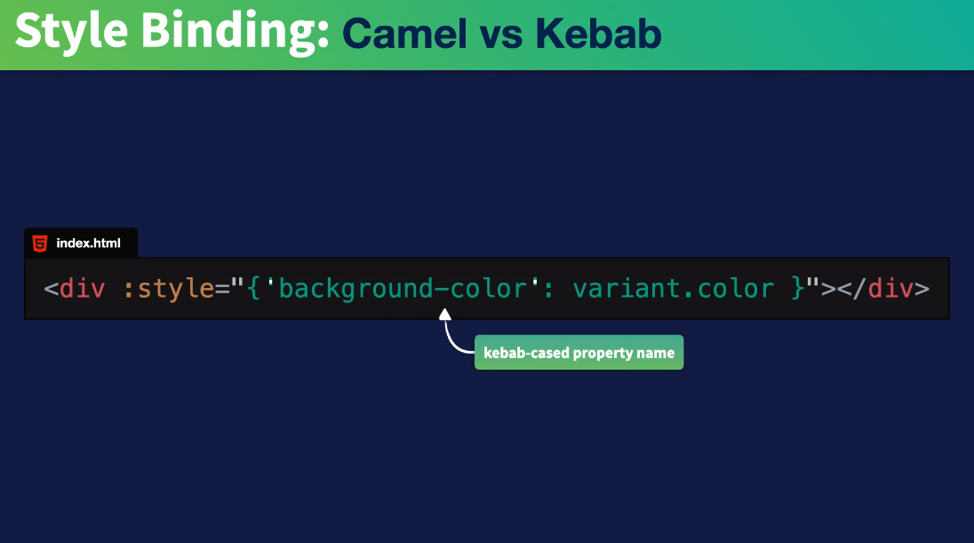 기본적으로 { } 안은 자바스크립트이기 때문에 kebab-case로 쓰면 '마이너스'로 인식한다.